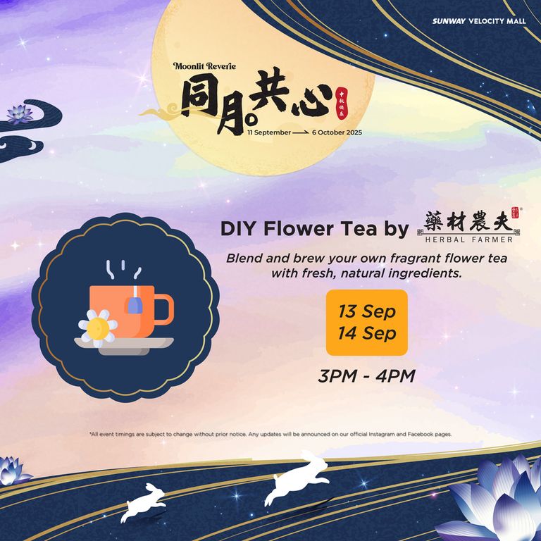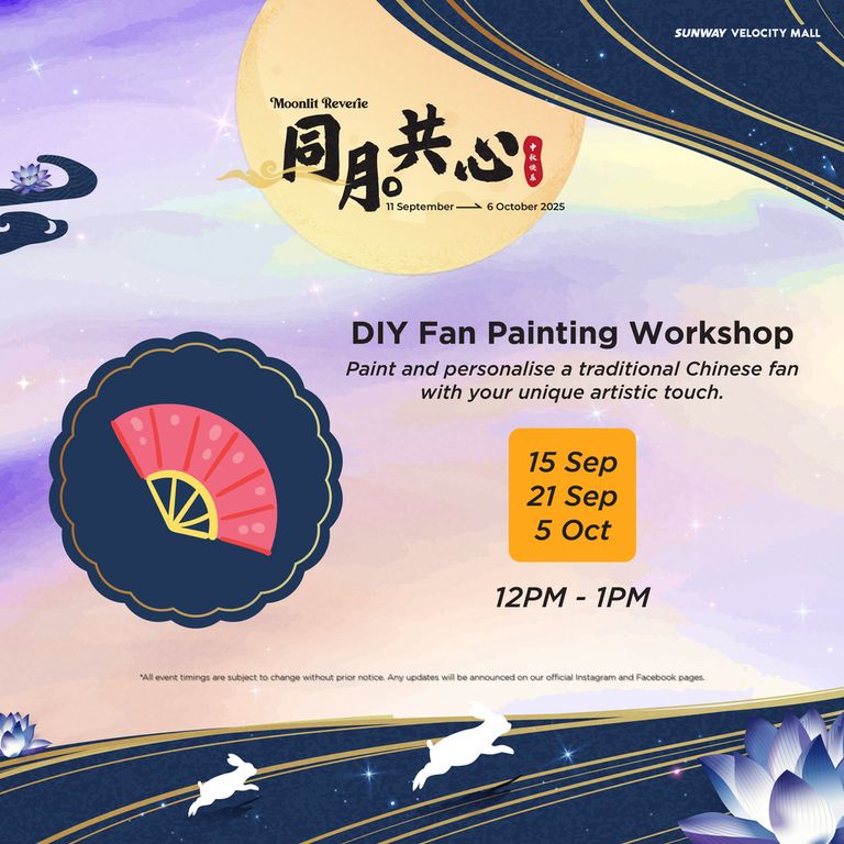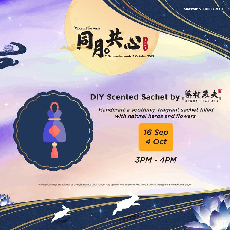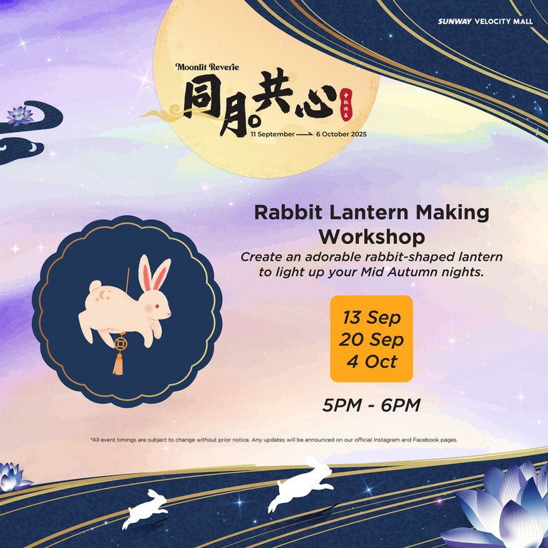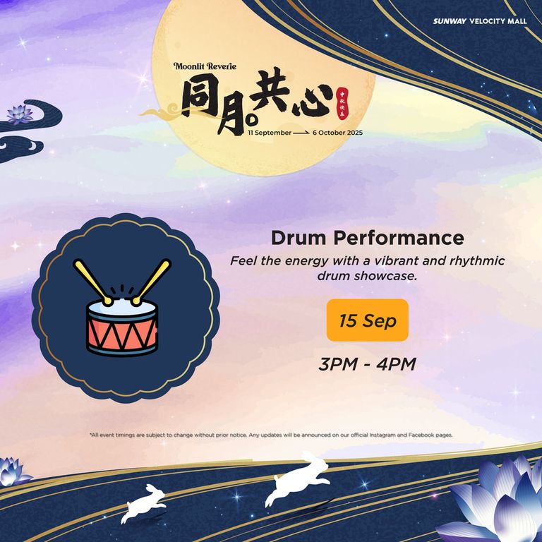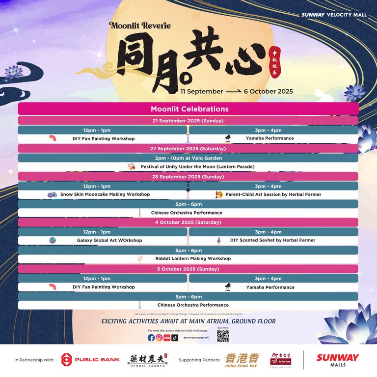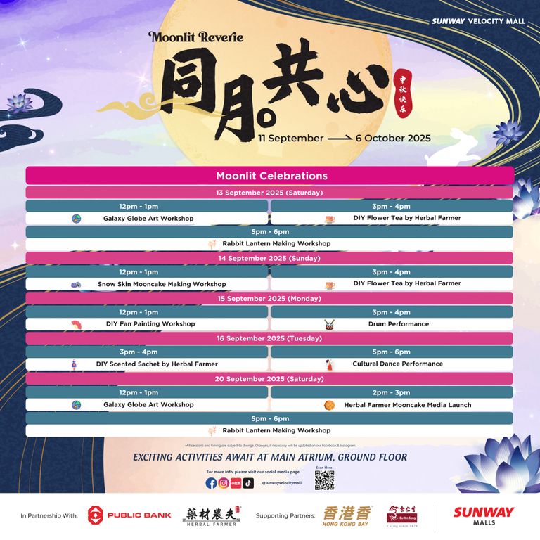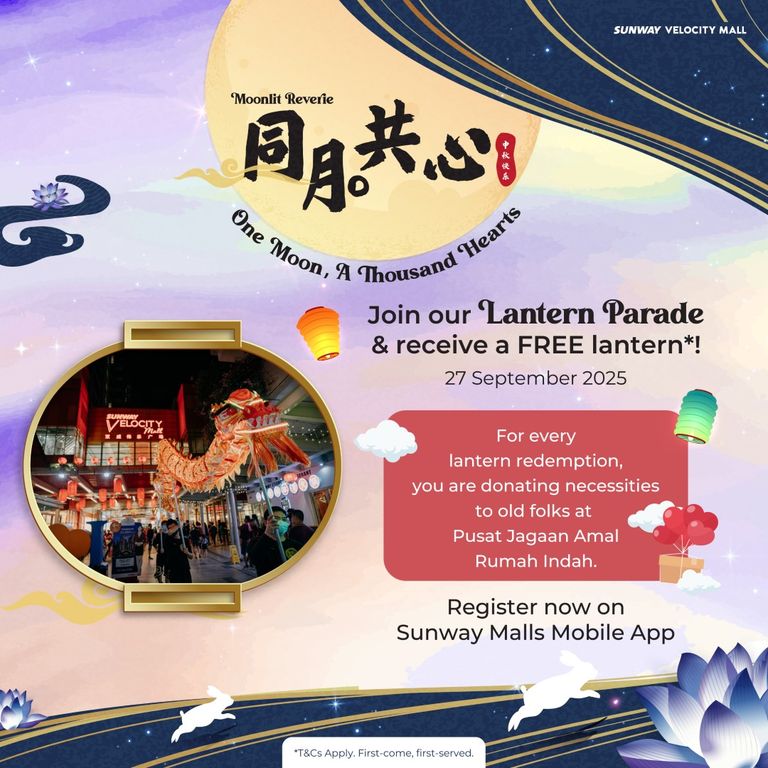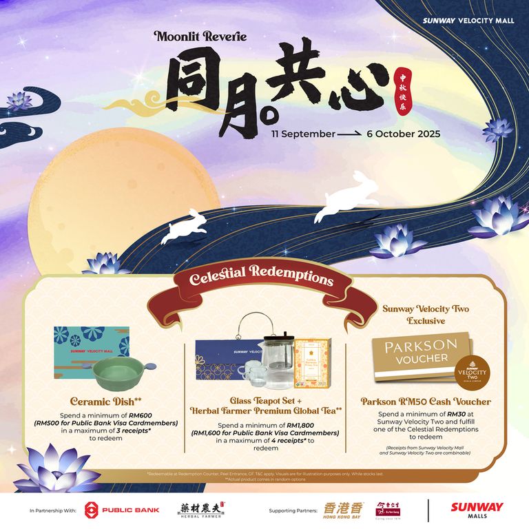 - Redemptions are exclusively for Sunway Velocity Mall, Sunway Velocity Two retail and Moonlit Reverie Mid-Autumn Booth vendors (GF) shoppers only. Redemptions are only valid for purchases made in Sunway Velocity Mall and Sunway Velocity Two on the same date as stated on the receipt(s) during the campaign period (11 Sept – 6 Oct 2025).