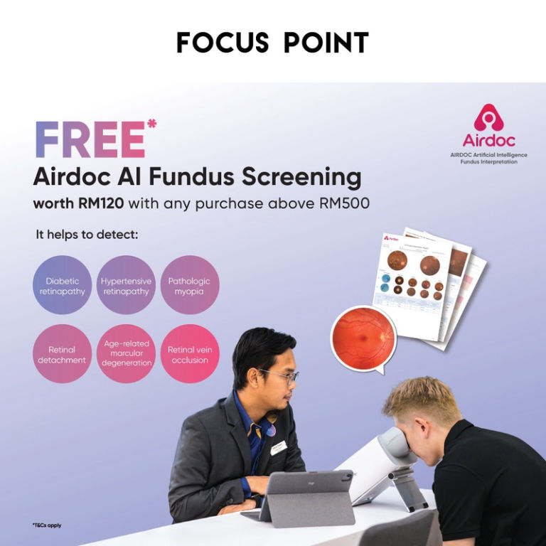 FREE Airdoc AI Fundus screening worth RM120 with purchase of eyewear above RM500.